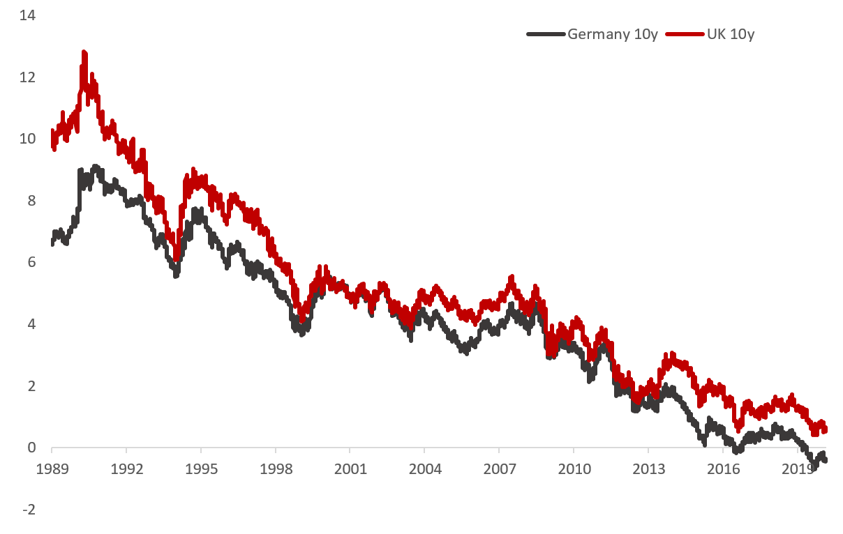 Graf 2. Kretanje prinosa na 10-godišnje obveznice Njemačke i UK-a