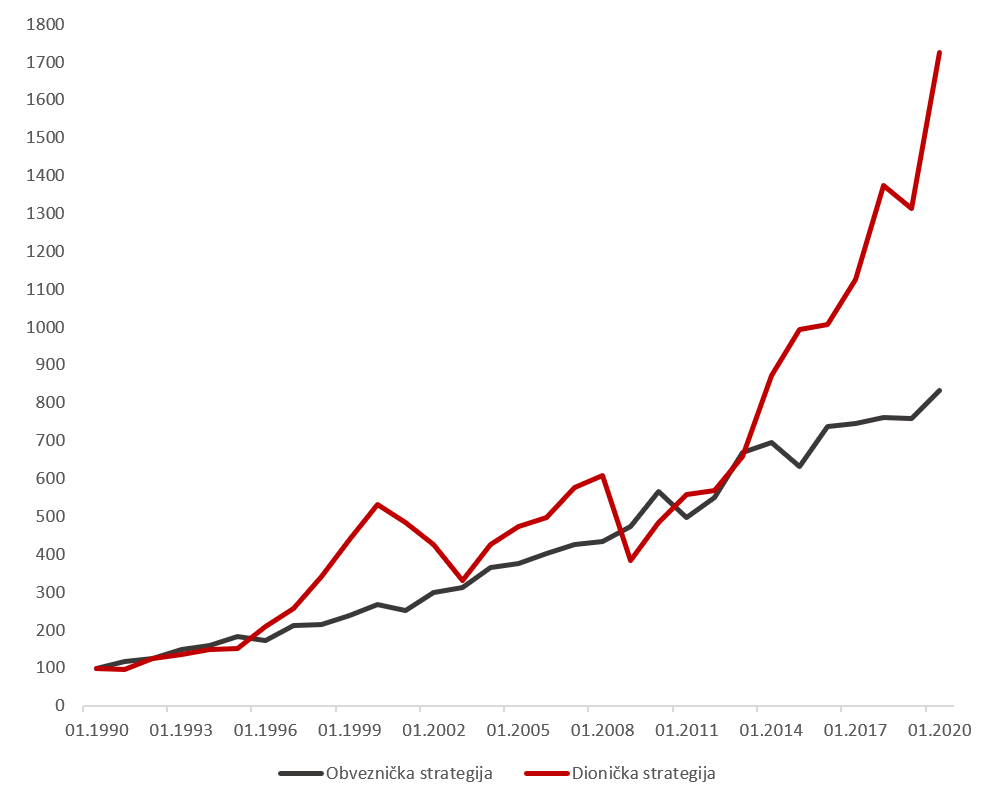 Gledajući iz današnje perspektive, situacija je ipak bitno drugačija. Prinosi na obveznice su reducirani na male pozitivne ili čak negativne brojeve, a kuponi na obveznice su svakim novim izdanjem sve manji. Istovremeno, kompanije i dalje pozitivno posluju, isplaćuju dividende i koriste niske kamatne stope kako bi jeftinije refinancirale vlastiti dug. Zbog toga je teško očekivati da će dugoročno u budućnosti obvezničke strategije ostvariti prinose usporedive s dionicama kao do sada, osim u slučaju da kamate odu u duboku negativu, npr. na -5%. Ima li to smisla u kontekstu strukturnih demografskih promjena, na svakom je od nas da procijeni.
