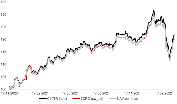 Graf 1. Premikanje vrednosti indeksa CROBEX10 tr, nabavne cene InterCapital CROBEX10 tr in InterCapital CROBEX10 NAV (vir: Bloomberg, InterCapital Asset Management)
